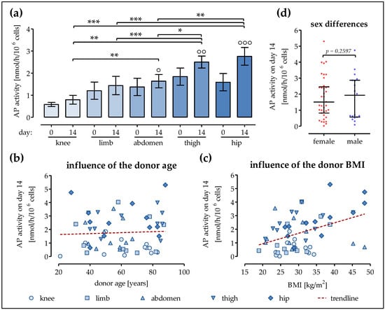 The alkaline phosphatase (AP) activity of Ad-MSCs varies depending on the donor site. Ad-MSCs derived from adipose tissue of the knee (N = 12), limb (N = 11), abdomen (N = 11), thigh (N = 12), and hip (N = 12) were osteogenically differentiated for 14 days. (a) AP activity was determined on days 0 and 14 of differentiation; (b) AP activity on day 14 of differentiation as a function of the donor age; (c) AP activity on day 14 of differentiation as a function of the donor BMI; (d) Comparison of the AP activity of differentiated (day 14) Ad-MSCs from male and female donors; ° p < 0.05, °° p < 0.01, and °°° p < 0.001 when comparing day 0 with day 14 within each group; * p < 0.05, ** p < 0.01, and *** p < 0.001 as indicated.
