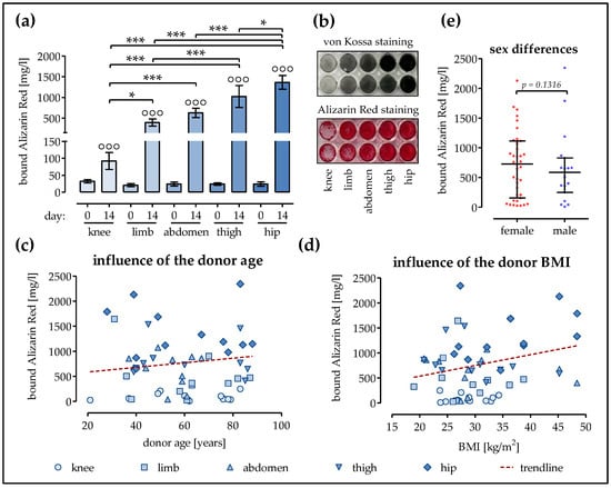 The formation of mineralized matrix by Ad-MSCs varies depending on the donor site. Ad-MSCs derived from adipose tissue of the knee (N = 12), limb (N = 11), abdomen (N = 11), thigh (N = 12), and hip (N = 12) were osteogenically differentiated for 14 days. (a) Matrix mineralization was quantified by Alizarin Red staining on days 0 and 14 of differentiation; (b) Representative scan of von Kossa- and Alizarin Red-stained Ad-MSCs from the different donor sites; (c) Mineralized matrix formed by differentiated (day 14) Ad-MSCs as a function of the donor age; (d) Mineralized matrix formed by differentiated (day 14) Ad-MSCs as a function of the donor BMI; (e) Comparison of the matrix mineralization of differentiated (day 14) Ad-MSCs from male and female donors; °°° p < 0.001 when comparing day 0 with day 14 within each group; * p < 0.05 and *** p < 0.001 as indicated.