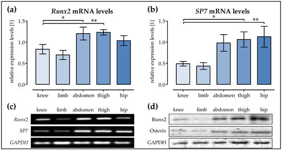 The expression of Runx2 and SP7 in Ad-MSCs varies depending on the donor site. Ad-MSCs derived from adipose tissue of the knee, limb, abdomen, thigh, and hip (N = 4 each) were osteogenically differentiated for 14 days. The relative expression levels of (a) Runx2 and (b) SP7 were determined by semi-quantitative RT-PCR. The PCR products were loaded twice (n = 2) to minimize the loading errors. The signal intensities were quantified with the help of the ImageJ software; (c) Representative images for the RT-PCR products from the pooled samples; (d) Representative images for the Western blot signals obtained from the pooled samples; * p < 0.05 and ** p < 0.01 as indicated.
