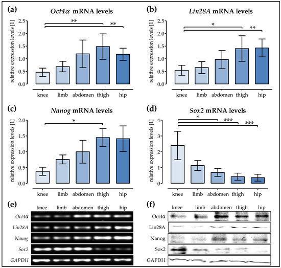 The expression of stem cell factors in Ad-MSCs varies depending on the donor site. The expression levels of the stem cell factors (a) Oct4α, (b) Lin28A, (c) Nanog, and (d) Sox2 were determined by semi-quantitative RT-PCR in Ad-MSCs derived from adipose tissue of the knee, limb, abdomen, thigh, and hip (N = 4 each). The PCR products were loaded twice (n = 2) to minimize the loading errors. The signal intensities were quantified with the help of the ImageJ software. (e) Representative images for the RT-PCR products from the pooled samples; (f) Representative images for the Western blot signals obtained from the pooled samples; * p < 0.05, ** p < 0.01, and *** p < 0.001 as indicated.