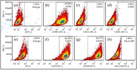 CD-marker expression in Ad-MSCs in passage 3. Ad-MSCs were stained for CD markers in passage 3. The analysis was done by flow cytometry as described [44] and is presented as scatter blot. Representative images for: (a) Isotype control for APC (allophycocyanin) secondary antibody. Ad-MSCs stained for (b) CD90-APC, (c) CD14-APC, and (d) CD45-APC. (e) Isotype control for PE (phycoerythrin) secondary antibody. Ad-MSCs stained for (f) CD73-PE, (g) CD105-PE, and (h) HLA-DR-PE.