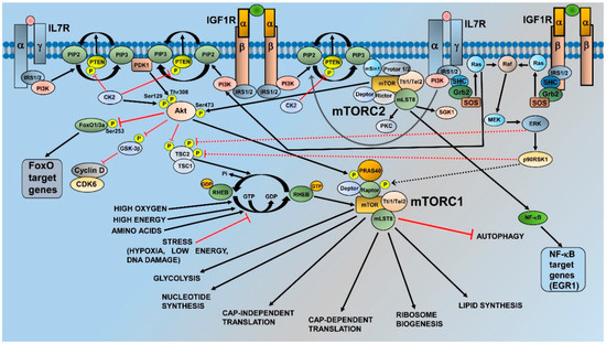 IL7/IL7R signaling has been documented to play a critical role in mTOR activation in T-ALL. IL7 and IL7R are essential for normal T-cell development and homeostasis, whereas disregulated IL7/IL7R activity promotes T-ALL [8]. In T-ALL, gain of function mutations of IL7Rα, which could be detected in about 10% of pediatric patients, resulted in the activation of PI3K/Akt/mTOR signaling [86,87]. Interestingly, both IGF1/IGF1R and IL7/IL7R activate not only PI3K/Akt but also the MEK/ERK module [81,88] (Figure 1). However, at least in human T-ALL cell lines, PI3K/Akt signaling was dominant over MEK/ERK in mediating cell proliferation and/or survival [81], although in the article by Triplett et al. [85], MEK/ERK activation by IGF1/IGF1R was detected in T-ALL cells co-cultured with thymic DCs. Moreover, IGF1/IGF1R and IL7/IL7R displayed non-overlapping roles in the control of T-ALL cell line growth [81]. However, further studies will be required to determine to which extent these findings apply to primary patient samples. In any case, it should be emphasized that NOTCH1 is a transcriptional activator also of the gene encoding IL7Rα [89].