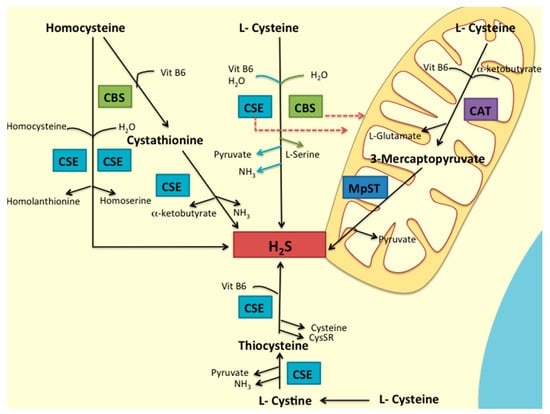 Pathways of H2S production in mammalian cells. H2S is synthesized from homocysteine or cysteine by the enzymes CBS and CSE, or by the sequential activity of CAT and MpST. In physiological conditions, CBS and CSE produce cytosolic H2S, whereas, in case of cellular stress, the enzymes can be relocated to the mitochondria, supporting CAT/MpST activities. Adapted from Wang [] and Olson et al. [].