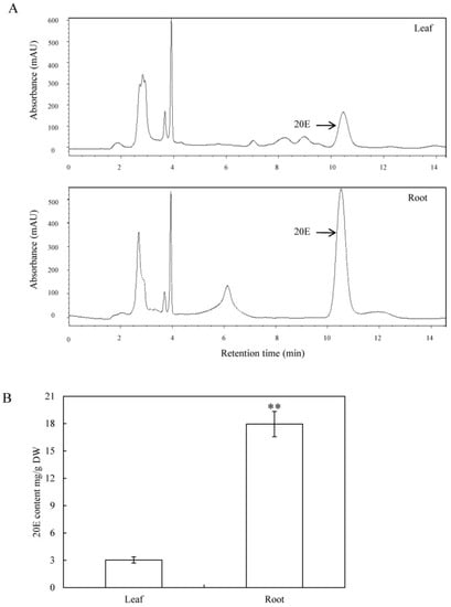 (A) Typical high-performance liquid chromatography (HPLC) chromatograms and (B) 20E contents in leaves and roots of C. arachnoidea. 20E was isolated from four-month old C. arachnoidea. Data are expressed as means ± standard deviation of three replicates. Statistical significance in comparison with the corresponding control values is indicated by ** p < 0.01.