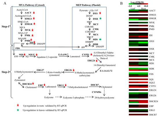 20E is an isoprenoid-derived compound using five-carbon building units of IPP or its possible isomer, DMAPP, which can be synthesized by both the MVA and MEP pathway in plants. Previous reports showed that phytoecdysteroid biosynthesis is limited to parts mediated via the MVA pathway [8]. In the C. arachnoidea transcriptome, unigenes encoding all the known structural enzymes in the upstream pathways up to IPP were found, including 11 unigenes for six enzymes in the MVA pathway, 15 unigenes for seven enzymes in the MEP pathway, and four unigenes for isopentenyl diphosphate isomerase (IDI) (Step 1 in Table 3 and Figure 2). According to the FPKM value, unigenes involved in the MVA pathway mostly showed higher expression levels in C. arachnoidea roots, such as AACT (comp70319_c0_seq8), PMK (comp65552_c0_seq7), and PMD (comp59477_c0_seq1). On the contrary, unigenes involved in the MEP pathway had higher expression level in leaves, such as DXR (comp47417_c0_seq1, comp74054_c0_seq1), MCS (comp30840_c0_seq1), HDS (comp33211_c0_seq1, comp67980_c0_seq1), and HDR (comp73401_c0_seq1). Moreover, the expression profile of unigenes involved in the MVA and MEP pathways were validated through real-time quantitative PCR (RT-qPCR) (Figure 3). Unigenes with the |relative expression level| ≥ 2 were presented in Figure 3A. The expression level of IDI was up-regulated 3.82-fold in roots. Expression of ACTT was up-regulated in roots by 3.80-fold. Additionally, unigenes encoding HMGR, HMGS, PKM, and PMD involved in the MVA pathway all had relative higher expression levels in C. arachniodea roots than in leaves. Except for DXS, unigenes encoding DXR and HDS involved in the MEP pathway were down-regulated in C. arachnoidea roots (Figure 3A). Because 20E is highly accumulated in roots, the genes encoding enzymes involved in 20E biosynthesis are expected to show a root-preferential expression pattern. These results implied that the backbone of 20E could be synthesized mainly through the MVA pathway rather than the MEP pathway in roots.