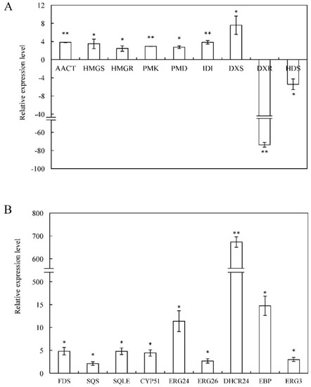 RT-qPCR analysis of selected genes involved in 20E biosynthesis. (A) Unigenes involved in terpenoid backbone biosynthesis. (B) Unigenes involved in steroid biosynthesis. Leaves and roots of four-month old C. arachnoidea were collected and their total RNAs were used for RT-qPCR analysis. Relative expression level of unigenes in roots was calculated by the 2−ΔΔCt method with actin as an internal control and was compared to those in leaves, which were all set to be 1. The negative value represents higher expression levels of unigenes in leaves than in roots. The error bar indicated standard deviations of three biological replicates. Asterisks represented significant differences: * p < 0.05 and ** p < 0.01. The full names of the abbreviations (unigenes) are provided in Table 3.