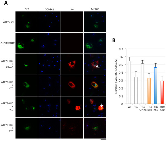 The α-Crystallin domain of CRYAB rescues Golgi localization of ATP7B-H1069Q mutant. (A) immunofluorescence analysis of COS7 cells transfected to express GFP-tagged ATP7B or ATP7B-H1069Q (ATP7B-H10) alone, or co-transfected to express full-length HA-tagged CRYAB or the isolated HA-tagged N-terminal (NTD), α-crystallin (ACD) and C-terminal (CTD) domains, as indicated on the left. After fixation, the cells were processed for triple confocal immunofluorescence analysis to reveal the Golgi complex with the marker GOLGA2. Note that the CTD was expressed at much lower level. White arrows point to region of GFP and GOLGA2 overlapping signal. Scale bar: 10 μm; (B) colocalization analysis of GFP and GOLGA2 signals (mean ± SD, n = 20 cells from two independent experiments). Abbreviations as in A.