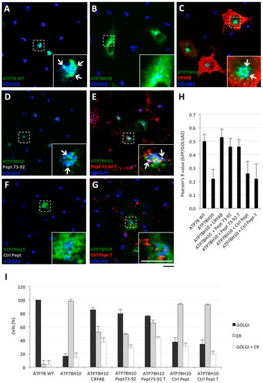 To assess whether Pept 73–92 was able to rescue the proper localization of ATP7B-H1069Q, as already established for the α-crystallin domain and full-length CRYAB, COS7 cells were either transfected to express GFP-tagged ATP7B or ATP7B-H1069Q, or co-transfected with full-length CRYAB as control. Next, the cells were incubated with either Pept 73–92 or with control peptides, tagged or untagged with TAMRA, from 24 to 48 h post transfection. Cells were then fixed and processed for confocal immunofluorescence analysis. As expected, ATP7B mainly localized in the Golgi complex, as indicated by co-localization with GOLGA2 protein (blue staining), whereas ATP7B-H1069Q was mainly present in the ER (Figure 2A,B). Most interestingly, in cells expressing ATP7B-H1069Q and either co-transfected with full-length CRYAB or incubated with untagged or TAMRA-tagged Pept 73–92, ATP7B-H1069Q showed Golgi localization as well as ATP7B (Figure 2C–E). In contrast, no such effect was observed in cells incubated with any version of the control peptide (Figure 2F,G).