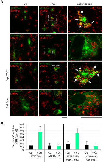 Encouraged by these findings, we next investigated whether the Golgi-corrected ATP7B-H1069Q was also able to be redistributed to the endolysosomal compartment upon Cu overload as ATP7B [14]. To address this question, COS7 cells were transfected to express GFP-tagged ATP7B or ATP7B-H1069Q, incubated as above with Pept 73–92 or control peptides, and finally incubated overnight in a medium containing 200 μM CuSO4. Strikingly, the confocal immunofluorescence analysis revealed that ATP7B, and Golgi-corrected ATP7B-H1069Q by the Pept 73–92, were able to move to post-Golgi vesicles visualised with the LAMP-1 lysosomal marker (Figure 3A). In contrast, in all other instances of Cu overload, as well as in the absence of Cu overload, almost no co-labelling of ATP7B forms and LAMP-1 was detected (Figure 3A).