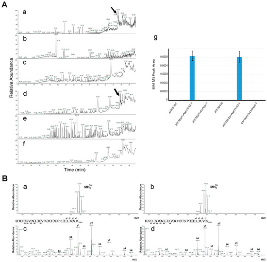 Proteins/peptides were extracted from the immunoprecipitation beads with an aqueous 5% formic acid solution. The supernatants were transferred onto Centricon devices (3 kDa cutoff) (Merck Millipore, Darmstadt, Germany) and filtered by centrifugation at 14,000× g for 30 min. Resulting samples were dried and vacuumed, and then analyzed with a nanoLC-ESI-Q-Orbitrap MS/MS system, consisting of an UltiMate 3000 HPLC RSLC nano system-Dionex coupled to a Q-ExactivePlus mass spectrometer through a Nanoflex ion source (Thermo Fisher Scientific, Waltham, MA, USA). Peptides were loaded on an Acclaim PepMap™ RSLC C18 column (150 mm × 75 μm ID, 2 μm—particles, 100 Å—pore size) (Thermo Fisher Scientific), and eluted with a gradient of solvent B (19.92/80/0.08 v/v/v water/acetonitrile/formic acid) in solvent A (99.9/0.1 v/v water/formic acid) at a flow rate of 300 nL/min. The gradient of solvent B started at 3%, increased to 10% over 5 min, increased to 30% over 40 min, rose to 80% over 5 min, remained at this percentage for 14 min, and finally returned to 3% in 1 min, remaining so for 30 additional minutes. The mass spectrometer operated in Selected Ion Monitoring (SIM) mode setting m/z = 560.69 ± 0.6 (charge 5+) with nominal resolution of 70,000, automatic gain control target of 50,000, and a maximum ion target of 100 ms, followed by MS/MS scans of the most abundant ion. MS/MS spectra were acquired in a scan m/z range 120–2000 using a normalized collision energy of 32%, an automatic gain control target of 200,000, a maximum ion target of 100 ms, and a resolution of 17,500. Two biological replicates were analyzed for each sample.