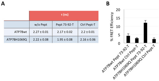 Next, we performed a Fluorescence Lifetime Imaging Microscopy (FLIM) analysis based on Fluorescence Resonance Energy Transfer (FRET) on cells manipulated as above and processed for confocal immunofluorescence microscopy [27,28]. FRET involves the transfer of energy from a fluorescent donor in its excited state to another excitable fluorophore (GFP and TAMRA, respectively, in our case). Indeed, FRET occurs when the distance between the donor and acceptor molecules is small (1–10 nm) and the fluorescence emission spectrum of the donor molecule overlaps to some extent the excitation spectrum of the acceptor, leading to a decrease of the donor fluorescence and reduction of excited state lifetime accompanied also by an increase in acceptor fluorescence intensity. FLIM measures the donor fluorescence lifetime τ which is reduced when FRET occurs for the energy transfer to the acceptor molecule, thus proving the interaction between two molecules. As shown in Figure 5A and Figure S4, we found that, only in cells expressing ATP7B-H1069Q and incubated with Pept 73–92, the τ value of the donor fluorescence lifetime decreased meaningfully (from 2.22 to 1.95 ns). This result was clearly emphasized when expressed as a FRET efficiency value (which represents the percent of lifetime decrease between a donor combined to an acceptor versus the donor alone, as reported in Figure 5B). It was 12%, indeed a quite significant value, whereas a minor value was obtained for ATP7B with Pept 73–92, only slightly above the background values measured with both constructs in the presence of the control peptide.