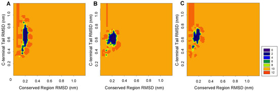 Two-dimensional backbone RMSD representation of the MD simulation results for comparison of the dynamics of the conserved region and the C-terminal tail region of three different ALAS2 systems at 300 K. (A) ALASm, (B) ALASdChA, (C) ALASdChB. The 288 K and 310 K RMSD landscapes also showed similar patterns (Supplementary, Figure S1).