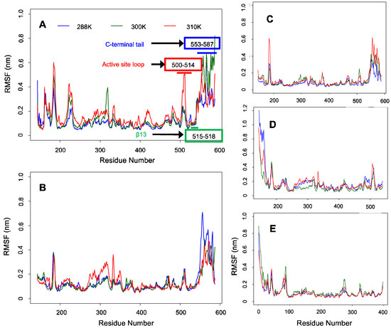 Backbone RMSF plots for ALAS2 and HemAm at three different temperatures. (A) ALASm, (B) ALASdChA, (C) ALASdChB, (D) ALASmWoT, (E) HemAm.