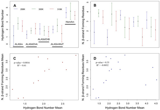 According to the linear regression analysis, there was a significant correlation between the mean hydrogen bond number and the mean number of β-strand forming residues in the analysis of the ALAS2 systems. Curiously, the homodimer asymmetry was also evident in this correlation analysis. In fact, two protomers showed different values of these parameters at the same temperature, although those systems (ALASdChA and ALASdChB) originated from the same MD simulation set at each temperature. There were much greater differences between A and B chains of the ALAS2 homodimer in terms of the number of β-strand-forming residues.