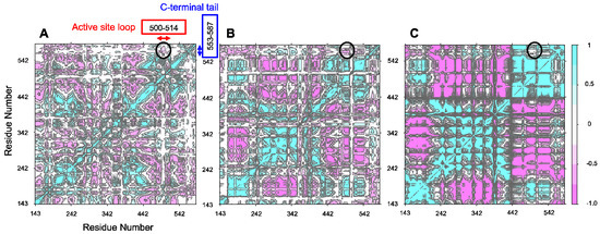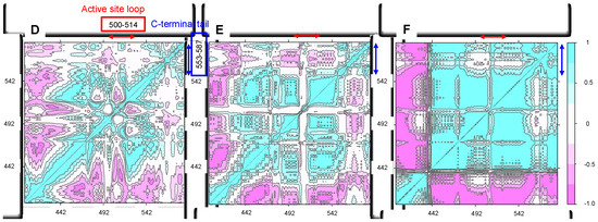 Correlation maps for the MD simulations of the wild-type C-terminal tail-containing ALAS2 systems at 300 K. (A) ALASm, (B) ALASdChA, (C) ALASdChB. 288 K, and 310 K correlation maps are provided in Supplementary, Figure S3. Black circles indicate the positioning of the anti-correlated data. (D–F). Zoomed in versions of (A–C), respectively.