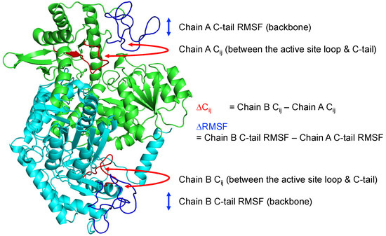 Representative structure of the ALAS2 homodimeric form observed in the molecular dynamics simulation. ∆Cij, and ∆RMSF measurement description is provided in a diagram. Red part of protein structure represents the active site loop, and blue part represents C-terminal tail (C-tail) in both protomers (Green: Chain A, Cyan: Chain B).