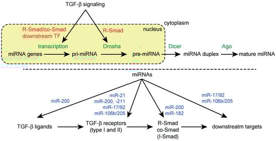 The TGF-β family is a multifunctional cytokine family that regulates multiple cellular functions, including cell growth, differentiation, adhesion, migration and death [12,13]. TGF-β signaling has many regulatory roles in development, with alterations in this signaling pathway having been associated with the pathogenesis of various diseases, including fibrotic disease, cardiovascular disease and cancer [14,15,16,17]. Previous studies have shown that the TGF-β signaling pathway embraces the miRNA pathway as an important component of its downstream signaling cascades [18,19,20,21,22,23,24]. In the present review, I summarize the connection between TGF-β signaling and miRNAs with a particular focus on: (1) regulation of miRNA expression by TGF-β signaling; (2) modulation of TGF-β signaling by miRNAs; (3) miRNA-mediated regulation of cell state transitions, such as epithelial–mesenchymal transition (EMT) and endothelial–mesenchymal transition (EndMT); and (4) crosstalk between miRNA and TGF-β pathways in cancer.