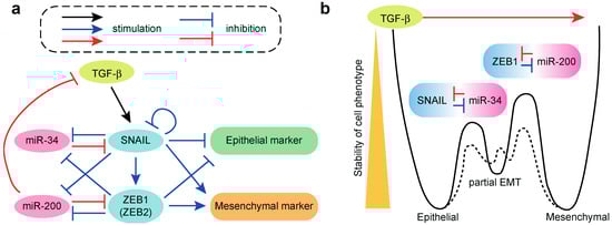 Roles of miRNAs in TGF-β-induced epithelial–mesenchymal transition (EMT). (a) EMT circuits containing a SNAIL-miR-34 loop and ZEB1-miR-200 loop; (b) A relationship between two miRNA-transcription factor (TF) modules and three EMT states. Solid line indicates the cell state transitions among epithelial, partial EMT and mesenchymal phenotypes, which are controlled by two miRNA-TF molecular switches. Dotted line suggests the alternative transition states generated by additional molecular switches.