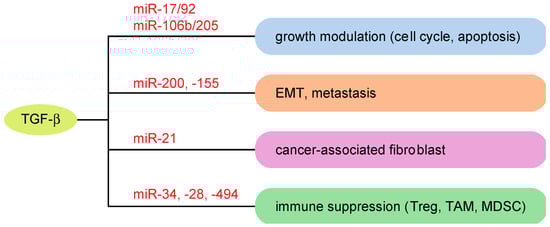 TGF-β signaling has been shown to play multiple important roles in cancer progression [15,16,17,54]. These can be largely categorized into four distinct processes: (1) growth modulation, particularly escape from growth inhibition by TGF-β at the early stage of cancer initiation; (2) enhanced synthesis of the extracellular matrix and fibrosis by TGF-β in the tumor microenvironment; (3) promotion of EMT and/or metastasis by TGF-β; and (4) immune suppression by TGF-β in the tumor microenvironment. TGF-β has been proposed to function both as a tumor suppressor and a tumor promoter, depending on the cancer type and the stage of cancer progression [15]. It is thought that TGF-β serves as a tumor suppressor through the inhibition of cell growth in the early stages of carcinogenesis. On the other hand, it has been suggested that TGF-β promotes tumor progression in the advanced stages of cancer by enhancing cancer cell migration, tissue fibrosis and/or immune suppression [58]. To date, it has been suggested that multiple miRNAs contribute to these processes in relation to TGF-β signaling [18,19,20,21,22,23,24].