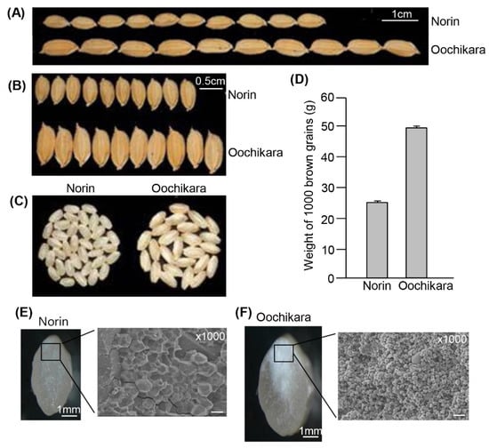 Phenotypic analysis revealed that Oochikara seeds did not differ substantially from wild-type seeds in visible features, except for the substantial difference in size and weight (Figure 1A–D), as observed previously for WY3 []. Thus, we further examined the grain phenotype of Oochikara using cross-sectioned seeds and found that Oochikara seeds had a chalky and floury endosperm. Scanning electron microscopy analysis of transversely sectioned endosperm revealed that the Oochikara had spherical starch granules that were loosely packed together (Figure 1F), unlike the irregular polyhedral starch granules of the wild-type seeds, which were densely packed (Figure 1E).