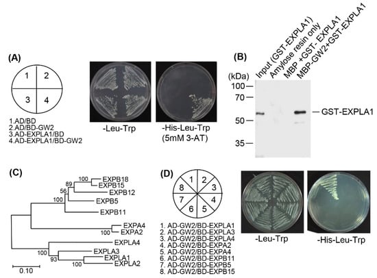 Grain Width 2 (GW2) and expansin-like 1 (EXPLA1) specifically interact in vivo and in vitro. (A) GW2 and EXPLA1 cDNAs were fused to sequences encoding the Gal4 activation domain (AD) or the Gal4 DNA-binding domain (BD) in pGAD424 and pGBT8, respectively. GW2 and EXPLA1 constructs were co-transformed into the yeast strain AH109. The transformants were plated onto minimal medium Leu/-Trp or Leu/-Trp/-His, including 5 mM 3-AT, and incubated for 4 days; (B) In vitro pull-down assays. MBP, MBP–GW2, and GST–EXPLA1 were overexpressed in Escherichia coli and purified using amylose (MBP) or glutathione (GST) resins, and then EXPLA1 was pulled down with GW2. GST–EXPLA1 bound to MBP–GW2 was detected by western blotting with an anti-GST antibody; (C) Phylogenic analysis between EXPLA1 and its homologs. The amino acid sequences of EXPLA1 and its homologs were aligned by CLUSTAL W, and the phylogenetic tree was constructed by MEGA 7.0 using the neighbor-joining method. Bootstrap values are shown for each node; (D) Examination of the interaction between GW2 and EXPLA1 and between GW2 and EXPLA1 homologs by yeast two-hybrid analysis. Full-length cDNAs encoding EXPLA1 homologs were fused to sequences encoding the Gal4 BD in pGBT8. The constructs for GW2 and each of the EXPLA1 homologs were co-transformed into the yeast strain AH109. After selection of the transformants on the minimal medium Leu/-Trp, the interaction between GW2 and each EXPLA1 homolog was examined on the minimal medium Leu/-Trp/-His.
