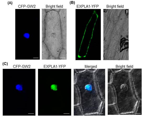 Expansins are enzymes located in the cell wall [] that break hydrogen bonds linking cellulose and hemicellulose []. Our results showed a strong interaction between GW2 and EXPLA1 (Figure 2A,B), suggesting that they localize to the same cellular compartment. To test this possibility, we investigated the subcellular localizations of GW2 and EXPLA1 using onion epidermal cells. The results showed that when they were expressed individually, CFP–GW2 was localized to the nucleus (Figure 3A) and EXPLA1–YFP was localized to the cell wall (Figure 3B). However, when they were expressed together, they both localized to the nucleus (Figure 3C).