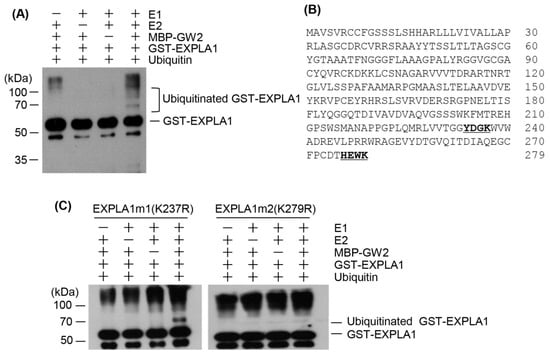 EXPLA1 is ubiquitinated by GW2 in vitro. (A) The ubiquitination reactions were performed in the presence or absence of rabbit E1, UbcH5b (E2), MBP–GW2 (E3), His6-ubiquitin, and GST–EXPLA1. Ubiquitinated EXPLA1 was detected by western blotting using an anti-GST antibody; (B) Deduced amino acid sequences of the EXPLA1 protein. Two putative ubiquitination sites are underlined in bold; (C) In vitro identification of the ubiquitination site on EXPLA1. The ubiquitination reaction mixture contained E1, E2, MBP–GW2 (E3), and His6-ubiquitin without (−) or with (+) a substrate protein. The mutant proteins, EXPLA1m1 and EXPLA1m2, have amino acid substitutions at residues that are predicted to be ubiquitin conjugation sites in EXPLA1, as indicated. After the reaction, ubiquitinated EXPLA1 protein was detected by western blotting with an anti-GST antibody.