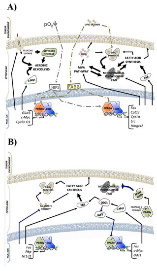 Mammalian cellular activities require a significant energy source, which is produced by specific mechanisms involved in the regulation of cellular energy homeostasis. The correct balance between catabolic and anabolic pathways strongly influence cellular fate, since they are involved in biochemical reactions that drive ATP (adenosine triphosphate) production/consumption. Oxidative glucose metabolism by OXPHOS (oxidative phosphorylation) produces up to 36 ATP per mole of glucose, whereas non-oxidative glucose metabolism by glycolysis results in two ATP per mole of glucose [1]. Hence, oxygen availability provides an optimal cellular condition to produce high levels of energy, while hypoxia determines a less efficient cellular condition in which the cells prefer to use glycolysis to produce energy. Another way to meet cellular energy demands is lipid metabolism by the peroxisomal and mitochondrial β-oxidation of fatty acids (FAs), which provides energy in the form of redox potential [2,3]. Regarding lipid metabolism, many cell types present cytosolic lipid deposits, also called lipid droplets (LDs). These are dynamic organelles that contain triacylglycerols (TAGs) and cholesteryl esters, and present several functions such as reducing lipotoxicity, lipid storage, and lipid metabolism, and they are directly involved in cellular physiology [4,5,6,7]. Unlike normal cells, cancer cells exhibit uncontrolled proliferation that needs energy metabolism adjustments in order to ensure their cell growth and division. The high proliferation rate in tumor cells leads to significant metabolic changes that are closely related to the environmental conditions and genetic/epigenetic characteristics of the tissue from which tumor arises. To safeguard their survival, cancer cells metabolically switch from less efficient energy pathways to higher performing energy pathways in order to cope with the considerable energy demands of tumor bulk. Meanwhile, neoplastic cells show altered glucose and lipid metabolism in association with unstable OXPHOS and glutamine metabolism; accordingly, PPARs play a key role in regulating these metabolic switch events. Therefore, our purpose in this review is to describe recent observations concerning the pivotal role of PPARs in promoting or preventing the characteristic metabolic switch that provides the energy for tumor survival. The main metabolic mechanisms adopted by tumor cells that are under the control of PPARs will be briefly described below.