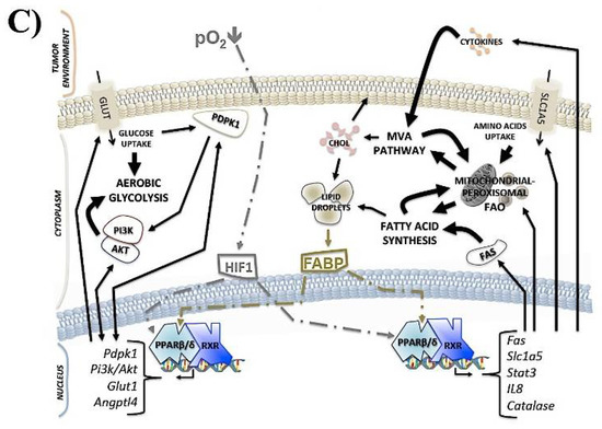 As mentioned above, PPARβ/δ plays, in concert with FAO, a key role in the preservation of HSCs, also in the presence of harsh environmental conditions. Regarding that, PPARβ/δ-FAO pathway undergoes an upstream regulation by the PML (promyelocytic leukemia) protein; which is codified by a tumor-suppressor gene. For example, Ito and colleagues [183] demonstrated that HSCs with Pml gene deletion were less inclined to asymmetric division with significant variation of the asymmetric/symmetric division ratio, and there are similar results also in breast cancer cells that sustain this observation [185]. These evidences provide further support regarding PPARβ/δ-FAO pathway regulation by PML upstream control. Therefore, abolishing the oxidative metabolism of fatty acids could damage cancer stem cells and more differentiated scaffold cells [183]. In this regard, a similar effect was observed in chronic lymphocytic leukemia (CLL) cells (Daudi cell line and primary culture), where the stressful environmental conditions stimulated PPARβ/δ expression by triggering a protective mechanism in cancer cells. Various kinds of harsh conditions were tested: low glucose, hypoxia, exposure to glucocorticoids, and cytotoxic agents. In any case, the response of tumor cells was to improve antioxidant activity and make better use of energy supplies through a proper metabolic pathway [186]. More recently, the involvement of PPARβ/δ signaling in the survival of CLL cell lines was reported. This event was associated with increased cholesterol and plasma membrane biosynthesis. Exposure to PPARβ/δ agonists was found to induce high cholesterol levels and interferon-dependent STAT phosphorylation. Cytokines stimulated the specific pathway related to cholesterol synthesis, while the inability of cytokines to upregulate PPARβ/δ was also demonstrated. On the other hand, PPARβ/δ could stimulate the cytokines expression in order to maintain the tumor microenvironment (as reported in Figure 1C) [187].