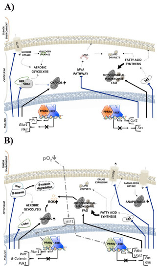 Regarding the Warburg effect and related aerobic glycolysis, the repression activity of PPARα on the GLUT1 gene with reduced glucose uptake was reported; these evidences were obtained in different cancer cell lines (HCT-116, SW480, MCF-7, and HeLa) (as indicated in Figure 2A) [71].