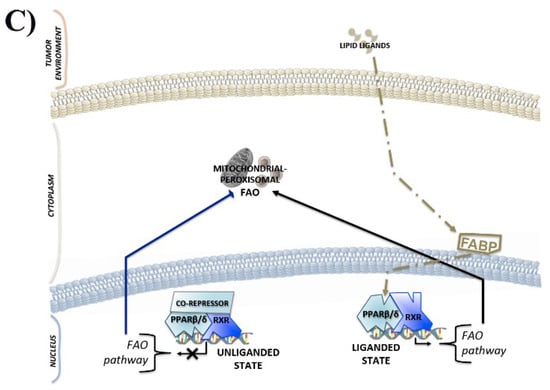 Unlike the evidence reported so far, the oncosuppressive activity of PPARβ/δ in prostate cancer was recently demonstrated [195]. In a tumor tissue biopsy of prostate cancer, low mRNA levels of PPARβ/δ were observed compared with benign tissue. The same results were obtained in prostate cancer cell lines (DU145, PC3, LNCAP, VCAP, C4-2, and 22RV); thus, the downregulation of PPARβ/δ was associated with high aggressiveness. In the absence of ligands, the PPARβ/δ could exist as a transcriptional repressor [172]; in fact, the inhibition of FAO was demonstrated when PPARβ/δ was overexpressed, but only in PC3 and LNCaP cell lines. The repressive effect on FAO was abolished by PPARβ/δ agonist, without affecting PPARβ/δ transcription levels. The results obtained confirm the suppressive role of PPARβ/δ in its unliganded form; see also Figure 2C [195].