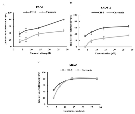 Inhibition of OS cell viability by CH-5 and curcumin was tested by the MTT assay. U2OS (A), Saos-2 (B), and MG-63 (C) cells were treated with various concentrations of curcumin and CH-5 for 24 h (control: cells treated with dimethyl sulfoxide). The results are expressed as mean ± standard deviation of three individual experiments having four technical replicates per experiment for each experimental condition.