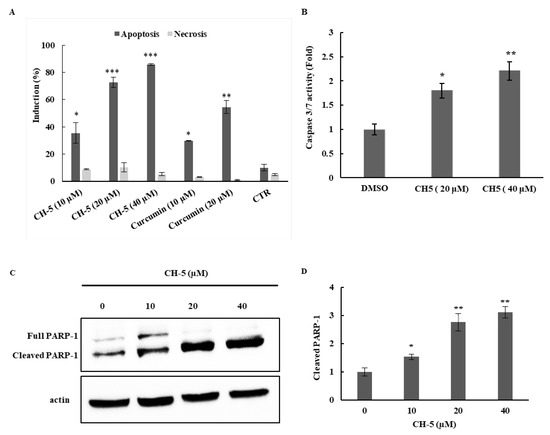 In order to determine whether the inhibition of CH-5 of the viability of OS cells was the result of apoptotic cell death, the externalization of phosphatidylserine (PS) during apoptosis was examined in U2OS cells by a fluorescence-conjugated annexin-V (FITC–AV)/propidium iodide (PI) double staining assay followed by flow cytometry. Annexin V is a 36 kDa calcium-binding protein with high affinity for PS, while the vital dye PI enters the dead and damaged cells that have compromised membranes but is excluded by the plasma membrane of viable cells. Therefore, viable cells are negative for both FITC–AV binding and PI, early apoptotic cells are positive for FITC–AV binding but negative for PI, late apoptotic cells are positive for both, whereas necrotic cells are negative for FITC–AV binding but positive for PI [23]. Approximately, 40% of U2OS cells were stained with FITC–AV after 24 h of exposure to 10 μM CH-5, about four times more than the control, treated with Dimethyl sulfoxide (DMSO), and two times more than cells treated with curcumin at the same concentration (Figure 2A). At a concentration of 20 μM, the number of apoptotic cells increased to almost 60% after curcumin exposure; however, once again, CH-5 was more potent, and more than 70% of cells were stained with FITC–AV at the same concentration. A further increase of CH-5 concentration to 40 μM elevated the number of apoptotic cells to over 80%, while the number of necrotic cells was low for all concentrations tested for both drugs. This dose-dependent fashion of apoptosis induction by CH-5 was also evident when assessing caspase 3/7 induction and cleavage of poly (ADP-ribose) polymerases-1 (PARP-1). Caspases are key effectors of apoptosis through the cleavage of various cellular substrates, such as pro-PARP-1 that is converted into the mature form PARP-1 [24]. As shown in Figure 2B, the treatment of U2OS cells with 20 and 40 μM CH-5 increased the levels of caspase 3/7 activity, as measured by a luminescence assay. Western blot analyses revealed a downregulation of the levels of pro-PARP-1 protein accompanied by an increase in the levels of PARP-1 protein, compared to the control (Figure 2C). Taken together, these results suggest that apoptosis induction by CH-5 is dependent on caspase activation in OS cells.