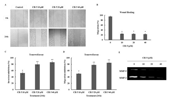 The effects of CH-5 on the migratory and invasive ability of U2OS cells. (A,B) U2OS migration in wound healing assays. A confluent monolayer was wounded with a sterile pipette tip, and the cells were allowed to migrate for 24 h in the presence of DMSO (control) or CH-5 at the indicated concentrations for 24 h. CH-5 reduced the migratory ability of U2OS cells compared to control cells (* p < 0.05); (C) Migration of U2OS cells in Transwell assays; (D) Invasion of U2OS cells in Matrigel, in Transwell assays. In both assays, the cells were seeded in the top chamber and treated with DMSO (control) or CH-5. After 24 h, the cells that had invaded through the membrane were stained, photographed, and quantified (bar graph). The data are expressed as means ± S.E.M. (n = 3); * p < 0.05 and ** p < 0.01 vs. no treatment; (E) CH-5 suppresses the expression of matrix metalloproteinase MMP-2 and MMP-9 in U2OS cells. The cells were treated with CH-5 at the indicated concentrations for 24 h and then subjected to zymography to analyze the activity of MMP-2/-9.