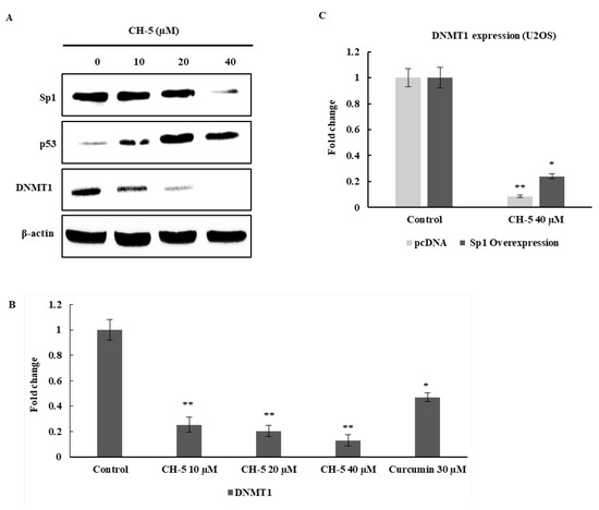 (A) CH-5 affects the expression of Sp1, p53, and DNMT1 proteins in U2OS cells. The cells were grown in a 60 mm dish and then were incubated with CH-5 at the indicated concentrations for 24 h. A 30 µg aliquot of total proteins was examined by western blotting, as described in Materials and Methods; (B) Effect of CH-5 and curcumin on the expression of DNMT1 mRNA, assessed by RT-PCR. U2OS cells were treated with DMSO, CH-5 10, 20, and 40 µM, or curcumin 30 µM for 24 h. The transcript levels were normalized using RPL30 as a reference gene; * p < 0.05 and ** p < 0.01; (C) Effects of CH-5 treatment and Sp1 overexpression on the mRNA levels of DNMT1. When U2OS cells were simultaneously exposed to CH-5 (40 µM) and transfected with an Sp1-expressing vector, there was a weaker downregulation of DNMT1, compared to control cells transfected with a control empty vector. The data are indicated as fold change in relative expression compared with RPL30 as a reference gene and on the basis of the comparative ΔΔCt method, and expressed as the mean ± standard deviation; * p < 0.05 and ** p < 0.01.