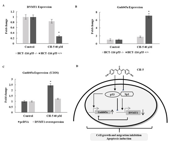 (A) Downregulation of DNMT1 (A,B) and upregulation of Gadd45a were observed in HCT116 wild-type (WT) cells treated with CH-5 (40 µM) for 24 h, but not in HCT116 p53−/− cells; (C) Gadd45a mRNA expression is reduced when U2OS cells are simultaneously exposed to CH-5 (40 µM) and transfected with a DNMT1-expressing vector, compared to control cells transfected with an empty vector. The data are indicated as fold change in relative expression compared with RPL30 as a reference gene and on the basis of the comparative ΔΔCt method, and expressed as the mean ± standard deviation; * p < 0.05; (D) A proposed model for CH-5’s action in osteosarcoma cells. CH-5 up- and downregulated p53 and Sp1 protein levels, respectively, thus promoting DNMT1 repression and then Gadd45a induction.