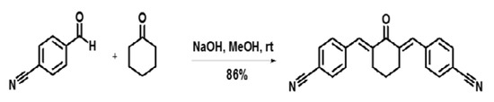 The synthesis of CH-5 was achieved by aldol condensation, using the general procedure reported by Hassan and co-authors, with minor modifications [49]. Briefly, 5 mL cyclohexanone (Sigma-Aldrich®, St. Louis, MO, USA) was added to a solution of 10 mL 4-formylbenzonitrile (Sigma-Aldrich®) in methanol (10 mL). The solution was stirred at room temperature for 10 min, followed by dropwise addition of a methanolic solution of NaOH (0.5 mL, 1.0 M). The reaction medium was stirred at room temperature and monitored by successive TLC analyses. When the reaction was finished, the residue was poured into crushed ice, resulting in precipitate, which was removed by filtration, washed with cold water, and recrystallized in ethanol. After these procedures, CH-5 was obtained in 86% yield (Figure 6). The structure of the compound was identified by 1H NMR and 13C NMR spectra analyses (Supplementary Materials).