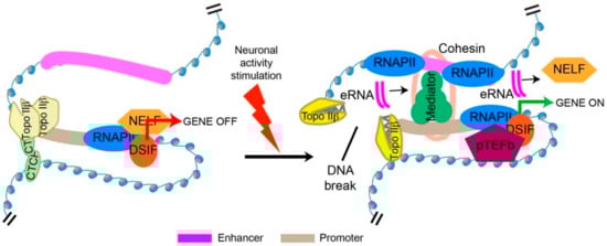 Model depicting the control of gene transcription through Topo IIβ-mediated DNA DSBs. (Left) Under basal conditions, RNAPII is held in a paused state through the actions of DSIF and NELF, and enhancer-promoter interactions are precluded through the imposition of a topological constraint by the architectural protein, CTCF. (Right) Upon activity stimulation, Topo IIβ-mediated DNA breaks override the CTCF-enforced constraint, and allow for enhancer-promoter interaction. In neurons, this interaction allows for the synthesis of enhancer RNAs (eRNAs) at enhancers, which in turn, mediate the release of NELF. The actions of pTEFb then allow for the escape of RNAPII from the promoter and trigger gene induction. eRNAs have also been shown to stimulate gene expression by stabilizing enhancer-promoter interactions through their interaction with the cohesin and/or mediator complexes, and by modulating chromatin structure at promoters. Adapted with permission from [].