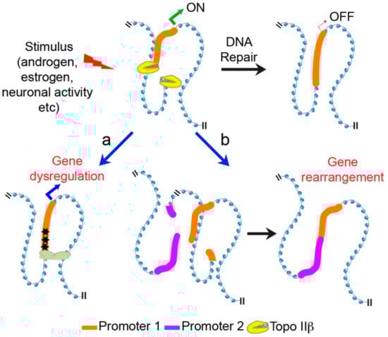 Defective repair of Topo IIβ-mediated DNA DSBs and disease. (Black arrow) The generation and accurate repair of Topo IIβ-mediated DSBs controls activity-induced gene expression in a number of systems. (Blue arrows) Two scenarios by which defective repair of stimulus-induced DSBs could lead to disease are depicted: (a) inaccurate repair leads to the accumulation of mutations (black stars) within the promoters of stimulus-responsive genes, and dysregulates their expression. For instance, disruption of ERG induction in neurons could reduce cognitive performance. (b) Aberrant recombinogenic repair of activity-induced DSBs could lead to gene arrangements. For instance, more than 50% of prostate cancer patients harbor recurrent gene fusions.
