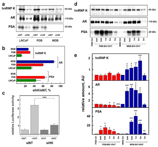 Figure 1. Effects of heterogeneous nuclear ribonucleoprotein K (hnRNP K) on the regulation of androgen receptor (AR) expression and AR transcriptional activity in LNCaP, PDB, and MDB cells. (a,d) Representative western blotting (WB) analysis carried out using antibodies against hnRNP K, AR, and prostate-specific antigen (PSA) and (b,e) quantitative analysis of total proteins extract from (a) hnRNP K-silenced (siHK) and -non-silenced (siNT) LNCaP, PDB, and MDB cell lines or (d) from control (Ctrl) PDB and MDB cell lines grown in the appropriate medium (see Material and Methods) or in restored LNCaP growth medium without bicalutamide (-BIC) and with 5-α-dihydrotestosterone(+DHT) for 2, 3 weeks (wk) or 1, 2, 3 months (m). The ordinate represents the mean ± SE (b) of the percentage of selected protein expression in hnRNP K-silenced cell lines or (e) the relative amounts of proteins determined by quantitative analysis. (c) AR transcriptional activity determined in hnRNP K-silenced and non-silenced LNCaP by the luciferase activity assay; * p < 0.05, ** p < 0.01, and *** p < 0.001 (Student’s t-test).