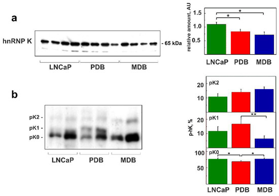 Figure 2. HnRNP K decreased expression and altered phosphorylation in resistant cell lines PDB and MDB compared with LNCaP. (a) WB analysis of hnRNP K expression in total extracts from LNCaP, PDB, and MDB cell lines. The histogram on the right side represents the mean ± SE of relative amount of proteins determined in six WBs. (b) The quantitative analysis of hnRNP K phosphorylation was carried out using 1D Phos-tag and WB analysis of LNCaP, PDB, and MDB total extracts. The histograms on the right side represent the mean percentage ± SE of phosphorylated hnRNP K (p-hK) evaluated in four experiments. The hnRNP K isoforms with minimal (phK0), intermediate (phK1), or maximal (phK2) phosphorylation are indicated; * p < 0.05 and ** p < 0.01 (Student’s t-test).