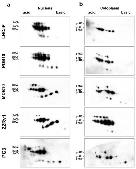 Figure 3. The hnRNP K phosphorylation status correlates with AR activity in prostate cancer cell lines. Nuclear (a) and cytoplasmic (b) profiles of hnRNP K phosphorylated isoforms in androgen-responsive LNCaP and resistant cell lines PDB, MDB, 22Rv1, and PC3, evaluated using 2D Phos-tag and WB analysis. The membranes were probed with an anti-hnRNP K antibody. The phK0, phK1, and phK2 identified in Phos-tag 1D (Figure 2b) are indicated.