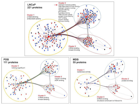 Figure 4. The hnRNP K interactome depends on the cellular phenotype. Protein–protein interaction networks of co-immunoprecipitates (co-IPs) obtained from LNCaP, PDB, and MDB, highlighting GO molecular function annotation restricted to prostate tissue grouped in three clusters, were realized in Cytoscape environment. The dot color refers to the Z score of protein intensity calculated on the basis of all three experiments: upregulated (red), downregulated (blue), and medium (black) value.