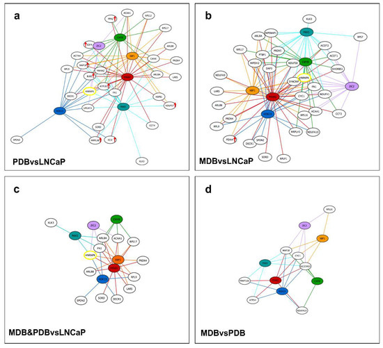 Figure 5. Transcriptional regulatory subnetworks of transcription factors (hK-TFs)potentially regulating the expression of differentially interacting hnRNP K proteins (DIhKPs) and selected DIhKPs, predicted and enriched by DAVID UCSC_TFBS option. The comparison of the subnetworks reveals dynamic remodeling of the hnRNP K interactome in LNCaP, PDB, and MDB. The six enriched hK-TFs are represented in colored circles, and DIhKPs in white circles, the edges are colored according to the hK-TFs. The subnetworks were grouped by the specific comparison of proteins abundance: PDBvsLNCaP (a), MDBvsLNCaP (b), MDB and PDBvsLNCaP (c), and MDBvsPDB (d). The red arrows indicate upregulated DIhKP expression; in all other cases, DIhKPs expression is downregulated.