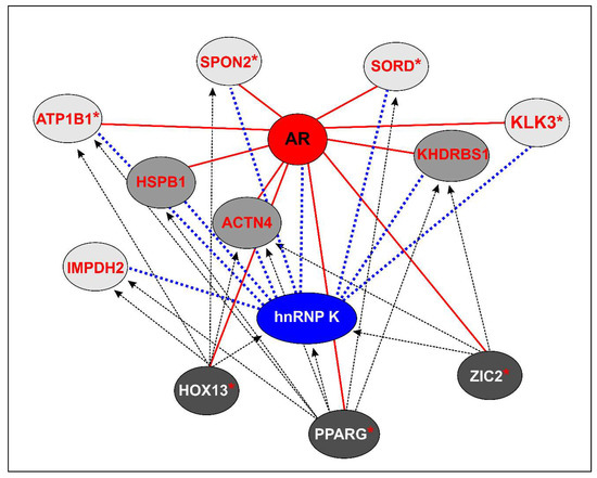 Figure 6. Schematic representation of the cross-talk network between hnRNP K, AR, the three AR-regulated hK-TFs, and the eight proteins selected for the hnRNP K–AR-related signature. The eight DIhKPs (heavy and light gray circles) directly or indirectly interact with hnRNP K (blue dotted lines). The hK-TFs (black circles) potentially control hnRNP K, and the eight DIhKPs (black dotted lines). AR coregulators (heavy gray circles) and androgen-responsive gene (ARGs) (highlighted with red *) are associated with AR (red solid lines).