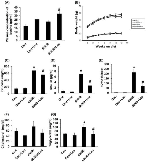 Plasma leucine concentration and insulin resistance measured by homeostatic model assessment-insulin resistance (HOMA-IR) were improved by leucine supplementation in db/db mice. Mice were sacrificed after 12 weeks of chew diet and normal drinking water. In mice treated with leucine, 1.5% w/v of leucine was added in the drinking water. (A) Plasma leucine concentration was measured by liquid chromatography-mass spectrometry (LC-MS) at week 12. (B) Body weights were monitored from week 0 to week 12 and were recorded biweekly. (C) Fasting glucose was measured in week 12 when mice were removed from metabolic cages. (D) Fasting mice insulin was measured in week 12 when mice were removed from metabolic cage. (E) HOMA-IR index was calculated by formula [HOMA-IR = (fasting glucose levels×fasting insulin levels)/22.5]. (F) Total plasma cholesterol levels were determined from mice 12 weeks after diet with leucine supplementation. (G) Plasma triglyceride levels were determined 12 weeks after diet with leucine supplementation. Data were presented as mean ± SEM, n = 5 in Con and Con + Leu groups; n = 6 in db/db and db/db + Leu groups. * p < 0.05, Con vs db/db mice; # p < 0.05, db/db vs db/db + Leu mice.