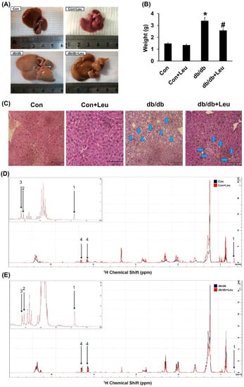 Leucine supplementation ameliorated hepatic steatosis in db/db mice. Mice were sacrificed, and livers were harvested after 12 weeks of chew diet and normal drinking water. In mice fed with leucine, 1.5% w/v of leucine was added in the drinking water. (A) The liver size and (B) weight of different groups of mice. (C) Livers were formalin-fixed and embedded in paraffin, and sections were stained with H&E stain. Arrows indicate macrovacuolar steatosis and the images were magnified 200×. Data were presented as mean ± SEM, n = 5 in Con and Con + Leu groups; n = 6 in db/db and db/db + Leu groups. * p < 0.05, Con vs. db/db mice; # p < 0.05, db/db vs. db/db + Leu mice. (D,E) Six hundred MHz 1H NMR spectra assignments with chemical shifts for signals identified in the liver lipid extract. The labeled peaks were: 1. total cholesterol (C-18, CH3); 2. free cholesterol (C-19, CH3); 3. esterified cholesterol (C-19, CH3); 4. Triglyceride (TG) (C-1/C-3, CH2).