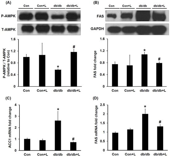 In db/db + Leu mice, AMPK was activated and the expression of hepatic fatty acid synthase (FAS) was reduced compared with that of db/db mice. Mice were sacrificed, and livers were harvested after 12 weeks of chew diet and normal drinking water. In mice treated with leucine, 1.5% w/v of leucine was added in the drinking water. (A) Hepatic phosphor-AMPK and AMPK levels were analyzed by Western blotting. The relative abundance of phosphorylated AMPK was calculated by Image J. (B) Relative abundance of the hepatic FAS was analyzed by Western blotting. The relative intensity of FAS was assessed by Image J. (C,D) qPCR analysis of the mRNA expression of the hepatic ACC1 and FAS. Data were expressed in fold relative to the expression in control mice. Data were presented as mean ± SEM, n = 5 in Con and Con + Leu (Con + L) groups; n = 6 in db/db and db/db + Leu (db/db + L) groups. * p < 0.05, Con vs. db/db mice; # p < 0.05, db/db vs. db/db + L mice.