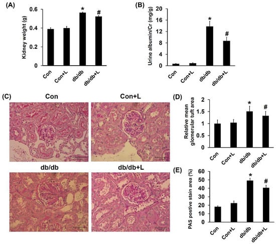 By contrast, single leucine supplementation has been shown to block high-fat diet (HFD)-induced obesity, hyperglycemia, and dyslipidemia in animal models [,]. In this regard, the use of dietary leucine supplementation has been extensively explored as the therapeutic intervention of obesity and obesity-induced metabolic dysfunctions, such as non-alcoholic fatty liver disease (NAFLD) and insulin resistance, despite its possible mTORC1 activation [,,]. The possible mechanisms underlying leucine benefits have been suggested to correlate with improving insulin signaling and decreasing inflammation in adipose tissue, which led to multiple aspects of the metabolic benefits, such as AMP-activated protein kinase (AMPK) activation []. However, the detailed molecular mechanism is still unclear. In the T2DM mouse model, Guo et al. [] showed that chronic leucine supplementation leads to better glycemic control, mitochondrial oxidative function, and reduced inflammatory profile. However, the possible beneficial effects of leucine supplementation on T2DM-related end-organ damage, such as DN and NAFLD, have not yet been investigated. As T2DM and associated end organs damage are important global health issues, it is of interest to explore if leucine supplementation can help to ameliorate these complications. In the present study, we evaluate the effects and explore the underlying mechanisms of dietary leucine supplementation in the amelioration of NAFLD and DN in db/db mice.