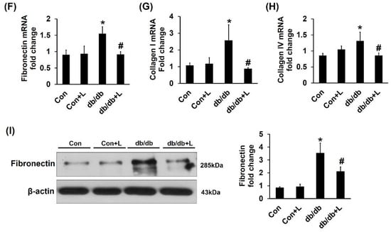 Total cellular protein from kidney and liver was extracted as previously described []. Equal amounts of proteins were mixed with an equal volume of reducing SDS sample buffer and boiled at 95 °C for 5 min. Protein samples (20 μg) were resolved by 10% SDS-PAGE and electroblotted on nitrocellulose membranes (Bio-Rad, Hercules, CA, USA). After electroblotting, nonspecific binding was blocked with 5% nonfat milk. The membrane was incubated with primary antibodies overnight at 4 °C and incubated with horseradish peroxidase–conjugated secondary antibodies for 1 h at room temperature. Primary antibodies against the following proteins were used at 1:1000 dilutions unless otherwise indicated: fibronectin, phosphor-AMPK, AMPK, FAS, and β-actin (1:20,000). Immunoreactive bands were visualized using enhanced chemiluminescence (Amersham, Arlington Heights, IL, USA) as previously described.